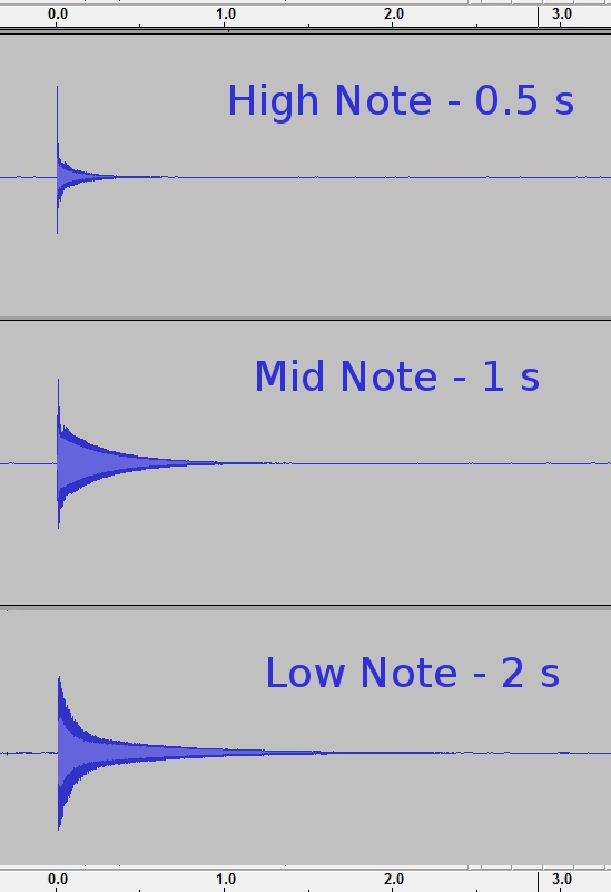 That is really our goal – to get a recognizable tone out of each of the high notes on the kalimba. The graph above shows what we are up against: the volume profile over time of a single plucked note – the bottom is E4, the middle note is high C6, and the top note is high E6. That is just the natural pattern of most kalimbas, to have less sustain on the highest notes.