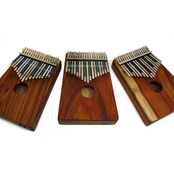 Three Hugh Tracey Treble kalimbas, in the keys you want them in, with tines painted in the colors you want, with or without pickup. You could get the standard G Treble, the Bb Treble, and the D Treble. Or you could get any three keys you want, including all three the same key, so you and your sister and brother can all three play together.